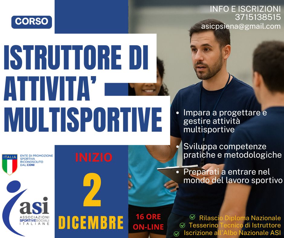 Al via il prossimo 2 dicembre il nuovo corso per Istruttore Attività Multisportive, rivolto a chi desidera ampliare le proprie competenze nel settore sportivo e acquisire una preparazione completa per la conduzione e la programmazione di attività motorie e sportive multidisciplinari.