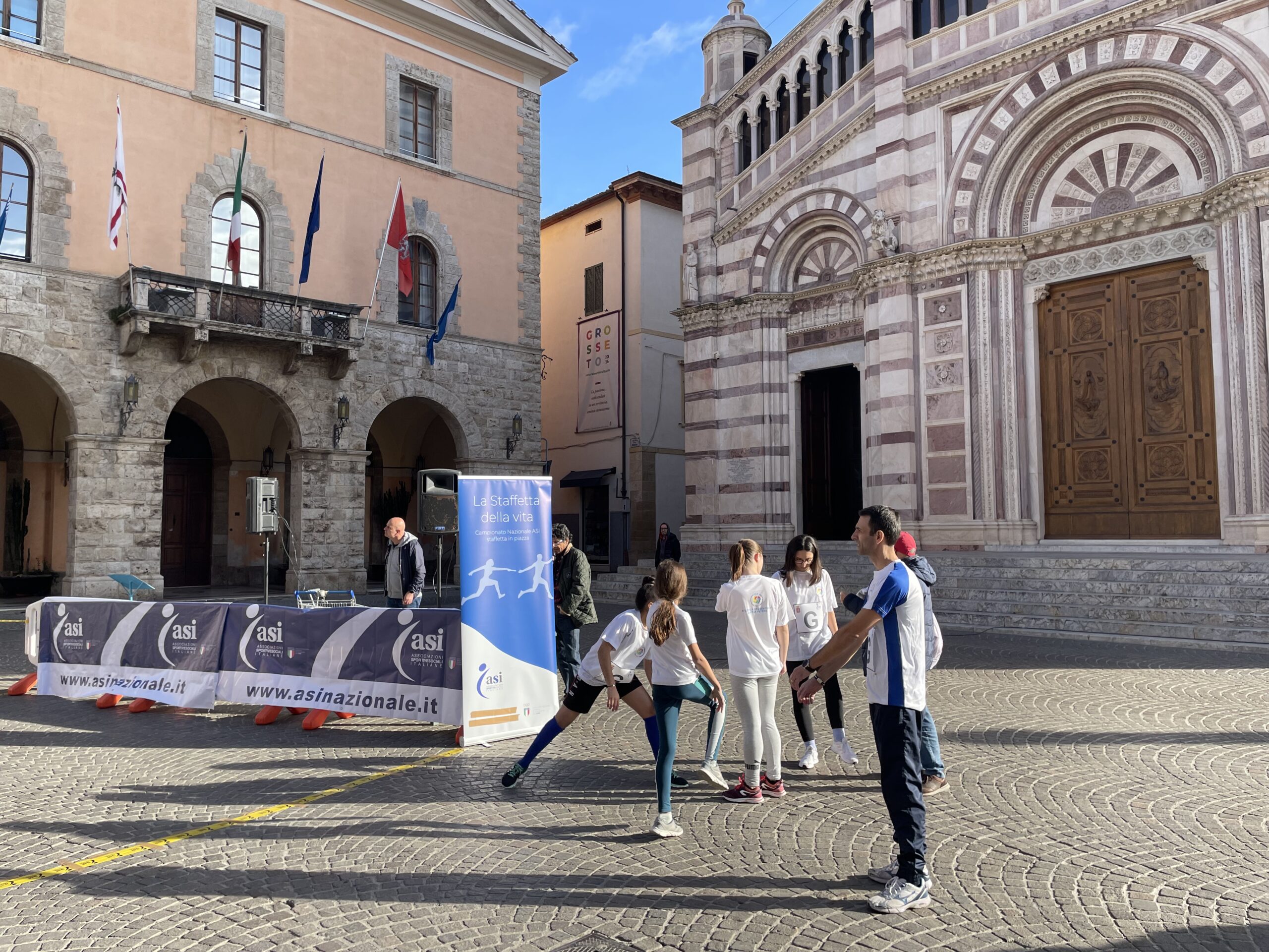 Staffetta in piazza a Grosseto. Il format è singolare: a correre sono formazioni da tutta Italia che per età si ispirano a un nucleo familiare. Allo start un under 14: prende il testimone un under 25, poi un under 35, un under 50 e un over 51. Un format alla terza edizione organizzato da ASI.