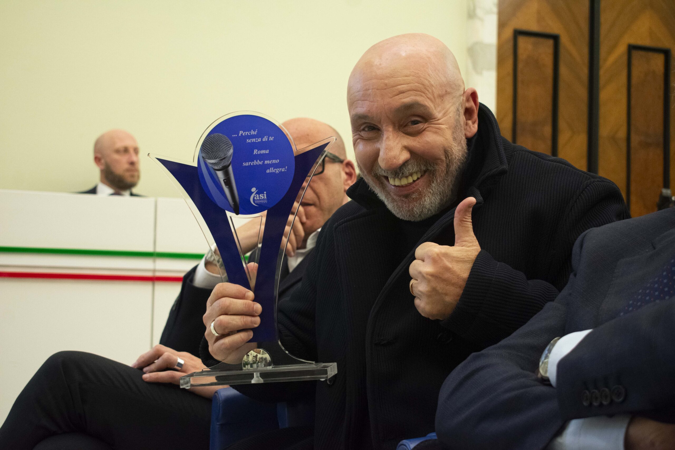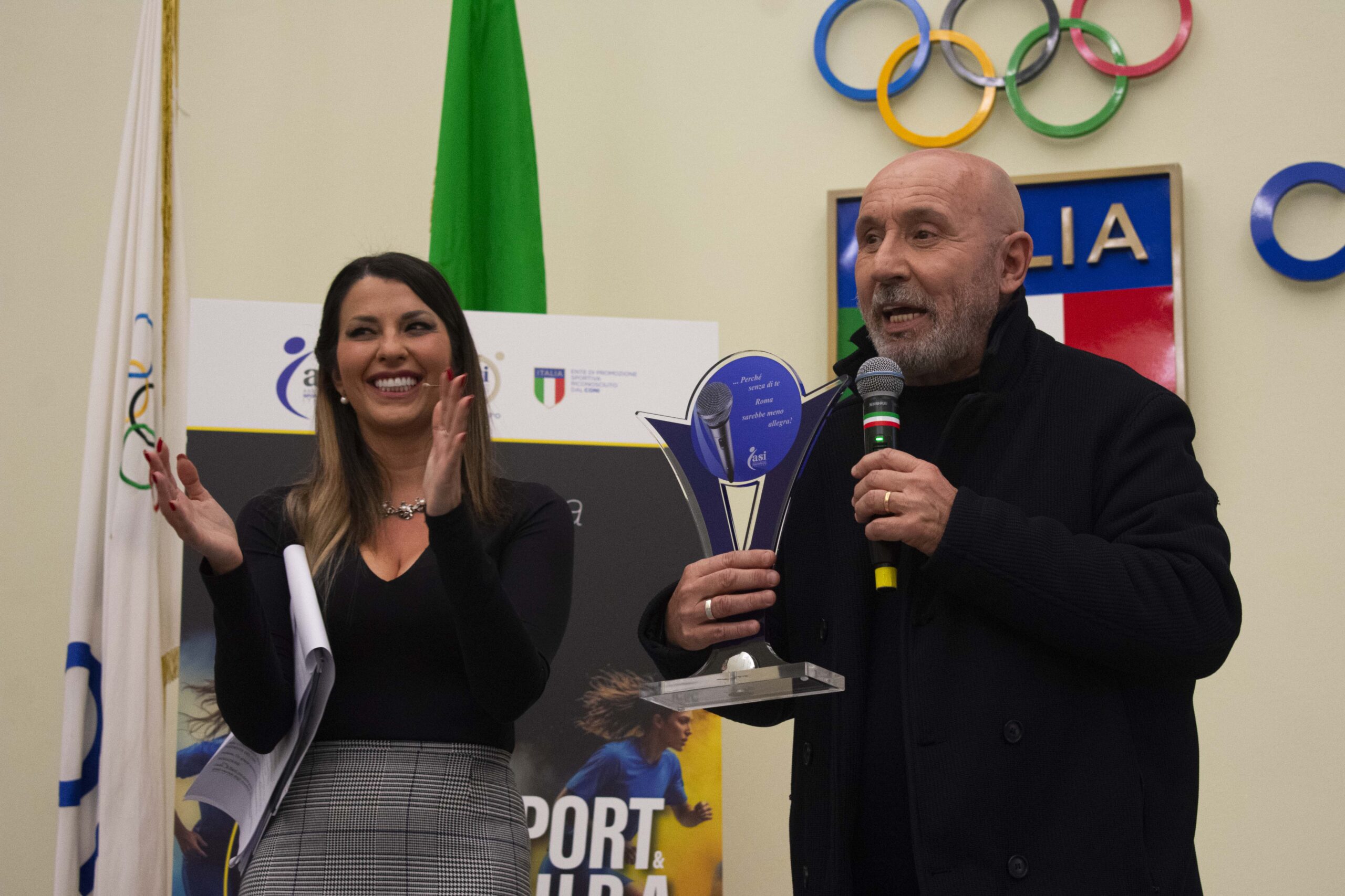 Tra gli invitati al premio anche Maurizio Battista, attore, cabarettista che ha strappato più di un sorriso alla folta platea. “Io il premio da sportivo non lo potevo prendere, quello del gesto etico nemmeno perché ho tre mogli: quindi non ho capito che c’entro qui oggi. Scherzi a parte, ringrazio ASI per questo riconoscimento”. A Battista una coppa con la scritta: “…Perché senza di te Roma sarebbe meno allegra”.