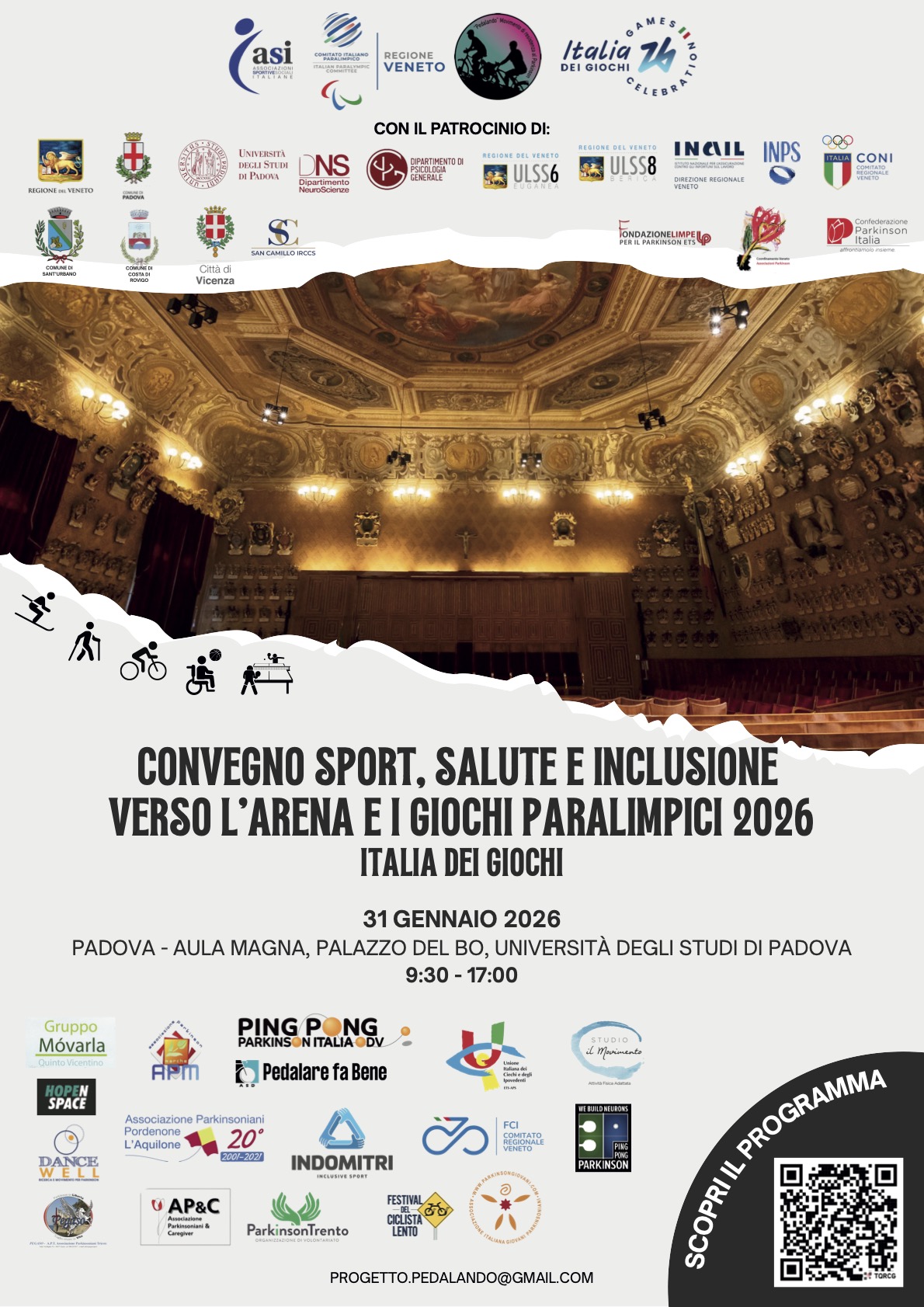 Si terrà a Padova, sabato 31 gennaio, nell’ Aula Magna dell’Università a Palazzo del Bo, il convegno “Sport Salute e inclusione verso l’Arena e i Giochi Paralimpici 2026”. Appuntamento che gode tra i vari patrocini di quello della Regione del Veneto, organizzato dall’associazione di promozione sociale “Pedalando, Movimento di resistenza al Parkinson” in collaborazione con il Comitato Paralimpico del Veneto, ASI Veneto, CONI, vari Comuni, Azienda Ospedale Università di Padova, Ulss 6 Euganea e accreditato alla Rete Italia dei Giochi-Milano Cortina 2026.