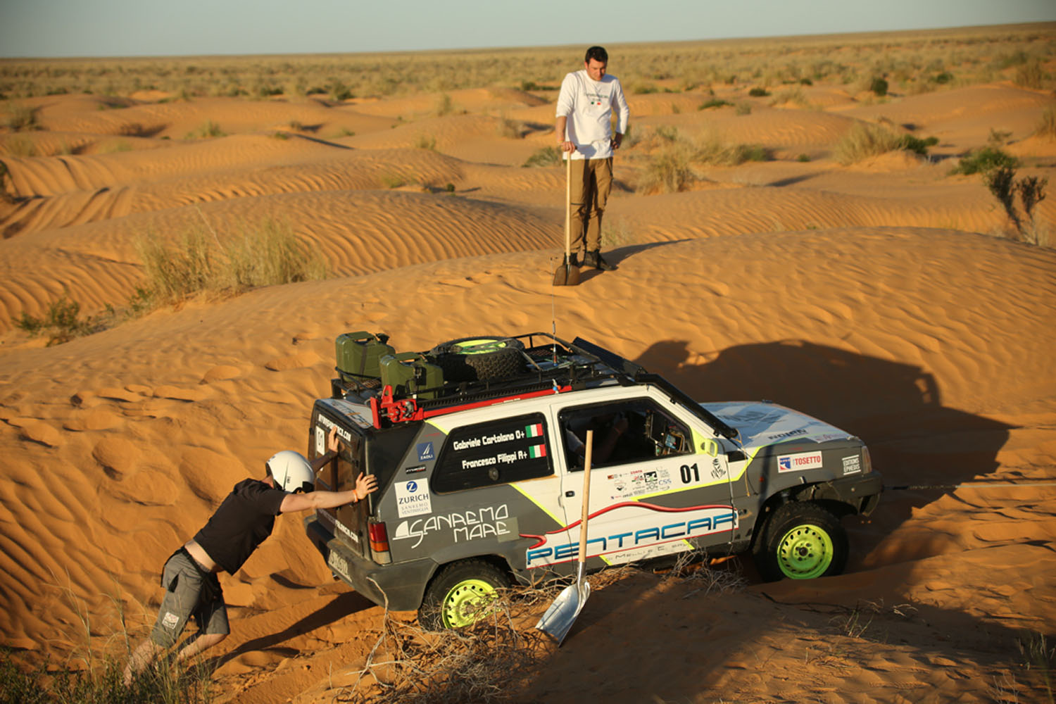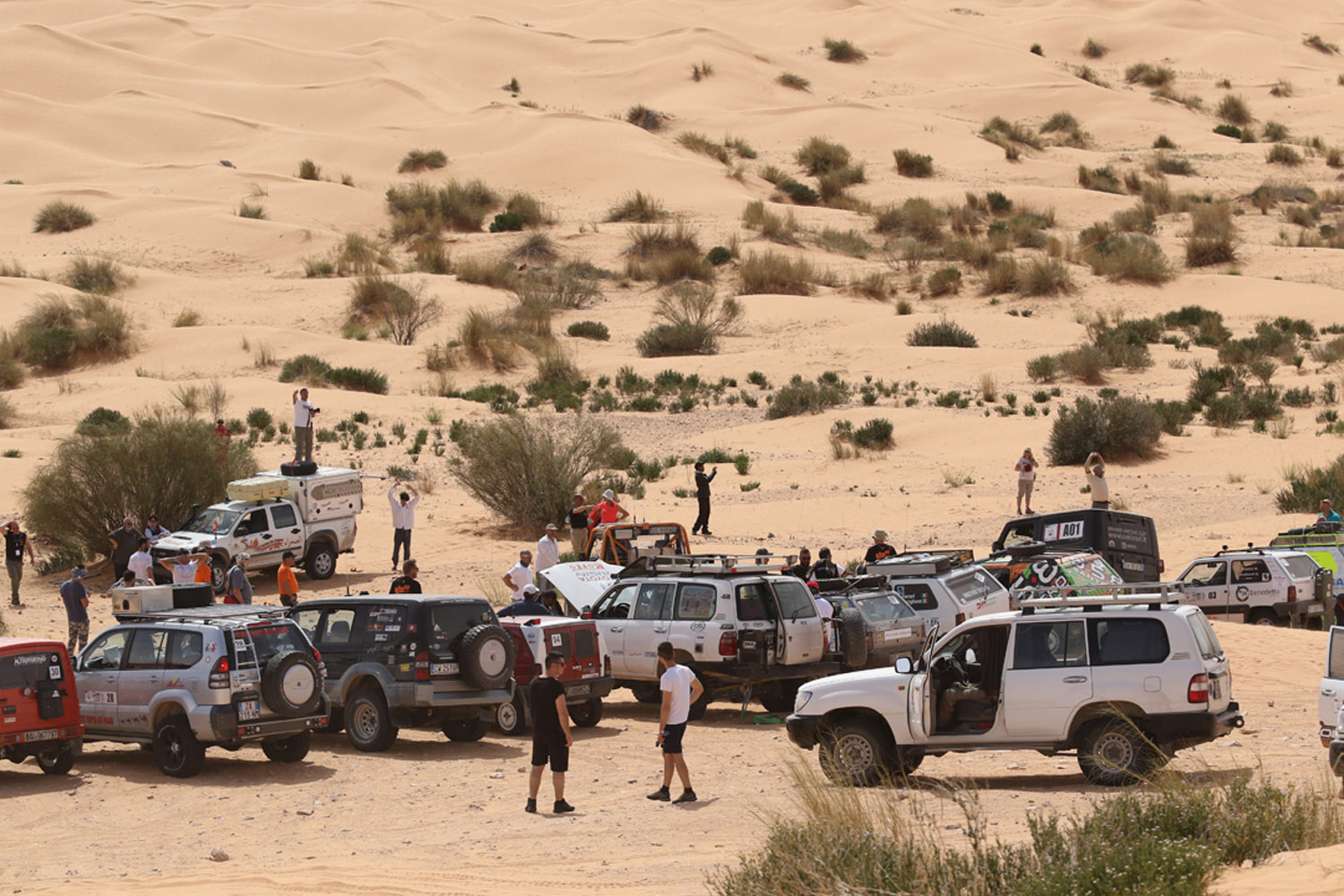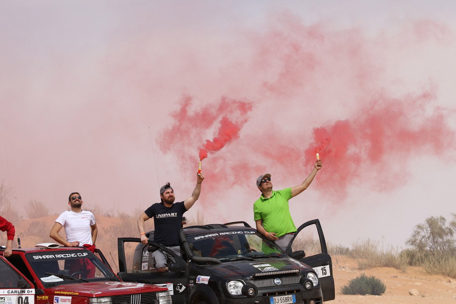 Partiti. Piccolo riassunto dei primi giorni. Dopo le verifiche tecniche e sportive eseguite dallo staff il giorno 22 aprile a Genova gli equipaggi si sono imbarcati per Tunisi il 23 e sono sbarcati regolarmente il 24 aprile. Grazie alla collaborazione della FTA ovvero la Federazione automobilistica tunisina, tutte le pratiche doganali si sono svolte in maniera estremamente veloce e precisa. Il loro aiuto e quello dei funzionari doganali è stato essenziale al fine di evitare le procedure spesso lunghe e complicate che rallentano le operazioni di sbarco. Ricordiamo che si trattava comunque di vetture che avevano a bordo molto materiale come pneumatici, ricambi e attrezzi. Ma tutto si è svolto con una celerità incredibile. Trasferimento sino a Hammamet dove hanno trascorso la notte in hotel prima di affrontare la prima tappa. Il 25 aprile trasferimento piuttosto lungo fino a Zmela. 570 km. Non pochi. Chilometri fatti in autostrada e strade statali che sono ben diverse dalle nostre. Infatti nelle loro autostrade è normale incontrare gente a piedi oppure con del carri trainati da asini piuttosto che cavalli. Ma anche venditori di frutta e verdura. E bambini che giocano. E le rotonde? Si. Sembrerà incredibile ma in autostrada ci sono anche delle rotonde. Quindi… chilometri non agevoli. Gli ultimi 50 invece su strade sterrate e gli ultimi 10 su piste del deserto. D’altronde… siamo pure sempre nel Sahara.