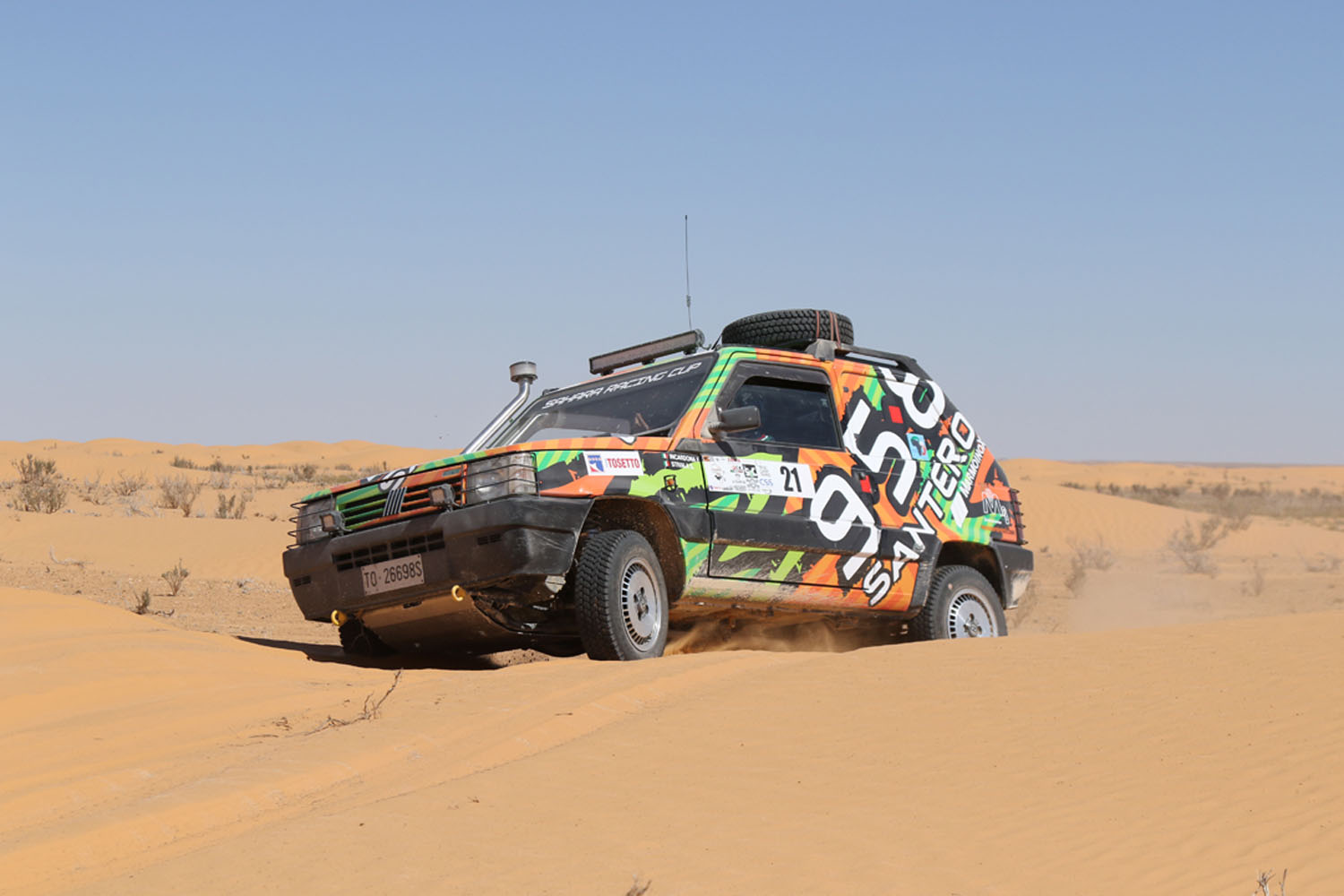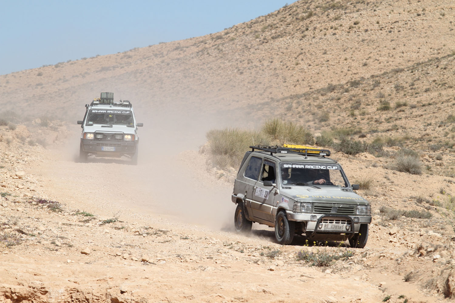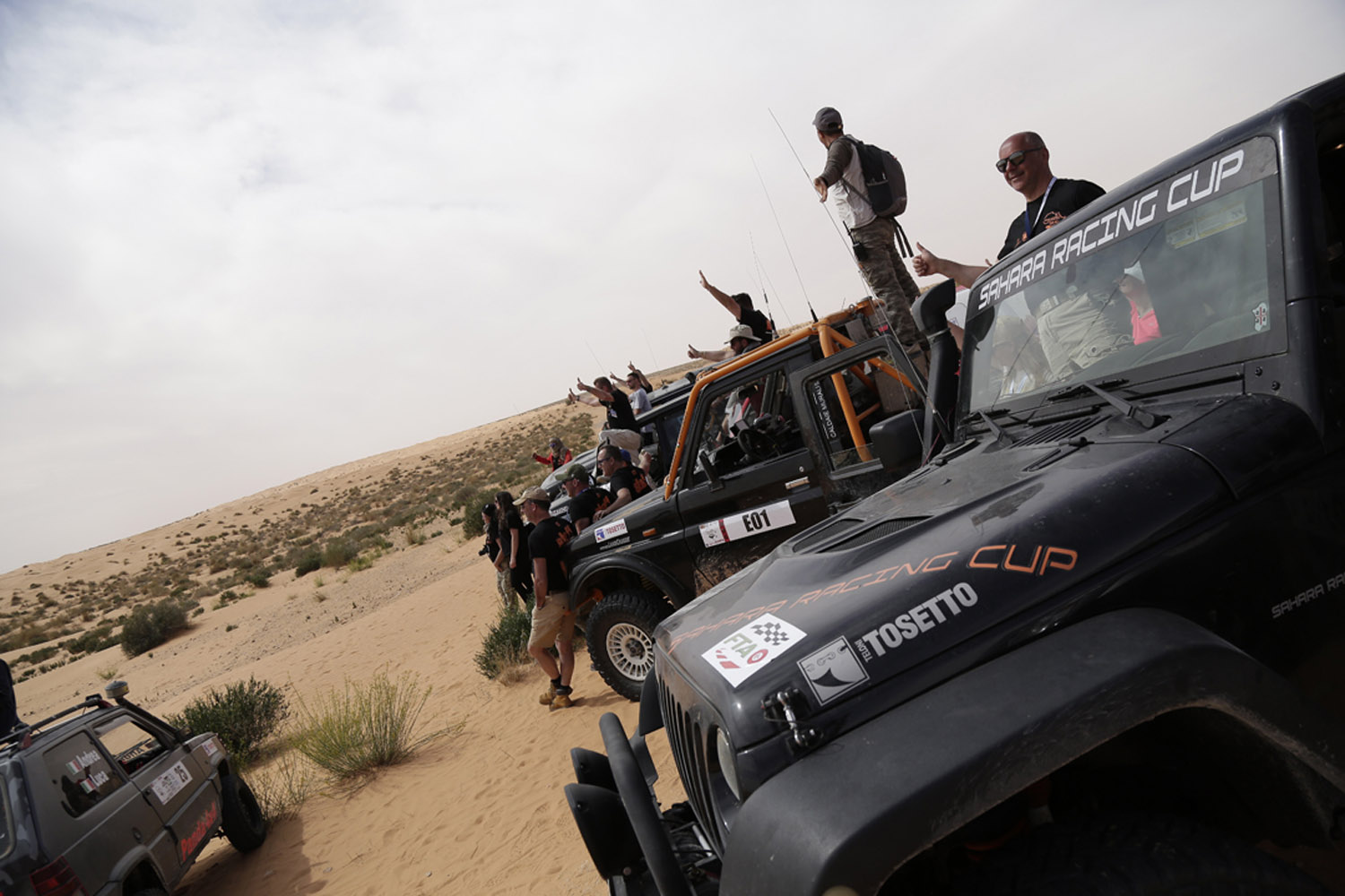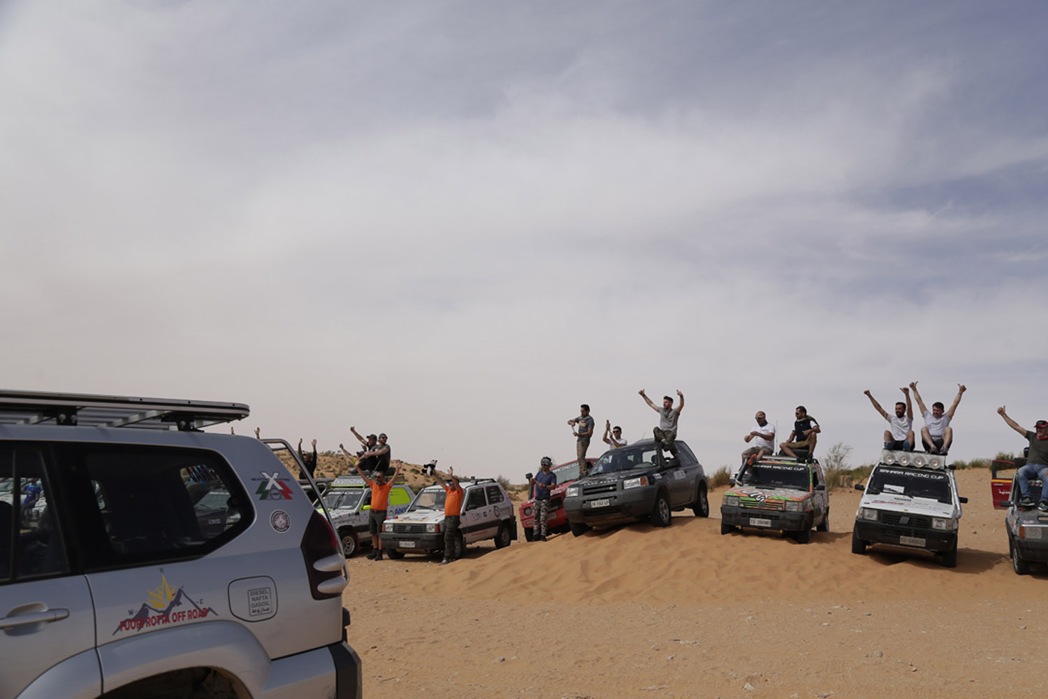 Partiti. Piccolo riassunto dei primi giorni. Dopo le verifiche tecniche e sportive eseguite dallo staff il giorno 22 aprile a Genova gli equipaggi si sono imbarcati per Tunisi il 23 e sono sbarcati regolarmente il 24 aprile. Grazie alla collaborazione della FTA ovvero la Federazione automobilistica tunisina, tutte le pratiche doganali si sono svolte in maniera estremamente veloce e precisa. Il loro aiuto e quello dei funzionari doganali è stato essenziale al fine di evitare le procedure spesso lunghe e complicate che rallentano le operazioni di sbarco. Ricordiamo che si trattava comunque di vetture che avevano a bordo molto materiale come pneumatici, ricambi e attrezzi. Ma tutto si è svolto con una celerità incredibile. Trasferimento sino a Hammamet dove hanno trascorso la notte in hotel prima di affrontare la prima tappa. Il 25 aprile trasferimento piuttosto lungo fino a Zmela. 570 km. Non pochi. Chilometri fatti in autostrada e strade statali che sono ben diverse dalle nostre. Infatti nelle loro autostrade è normale incontrare gente a piedi oppure con del carri trainati da asini piuttosto che cavalli. Ma anche venditori di frutta e verdura. E bambini che giocano. E le rotonde? Si. Sembrerà incredibile ma in autostrada ci sono anche delle rotonde. Quindi… chilometri non agevoli. Gli ultimi 50 invece su strade sterrate e gli ultimi 10 su piste del deserto. D’altronde… siamo pure sempre nel Sahara.