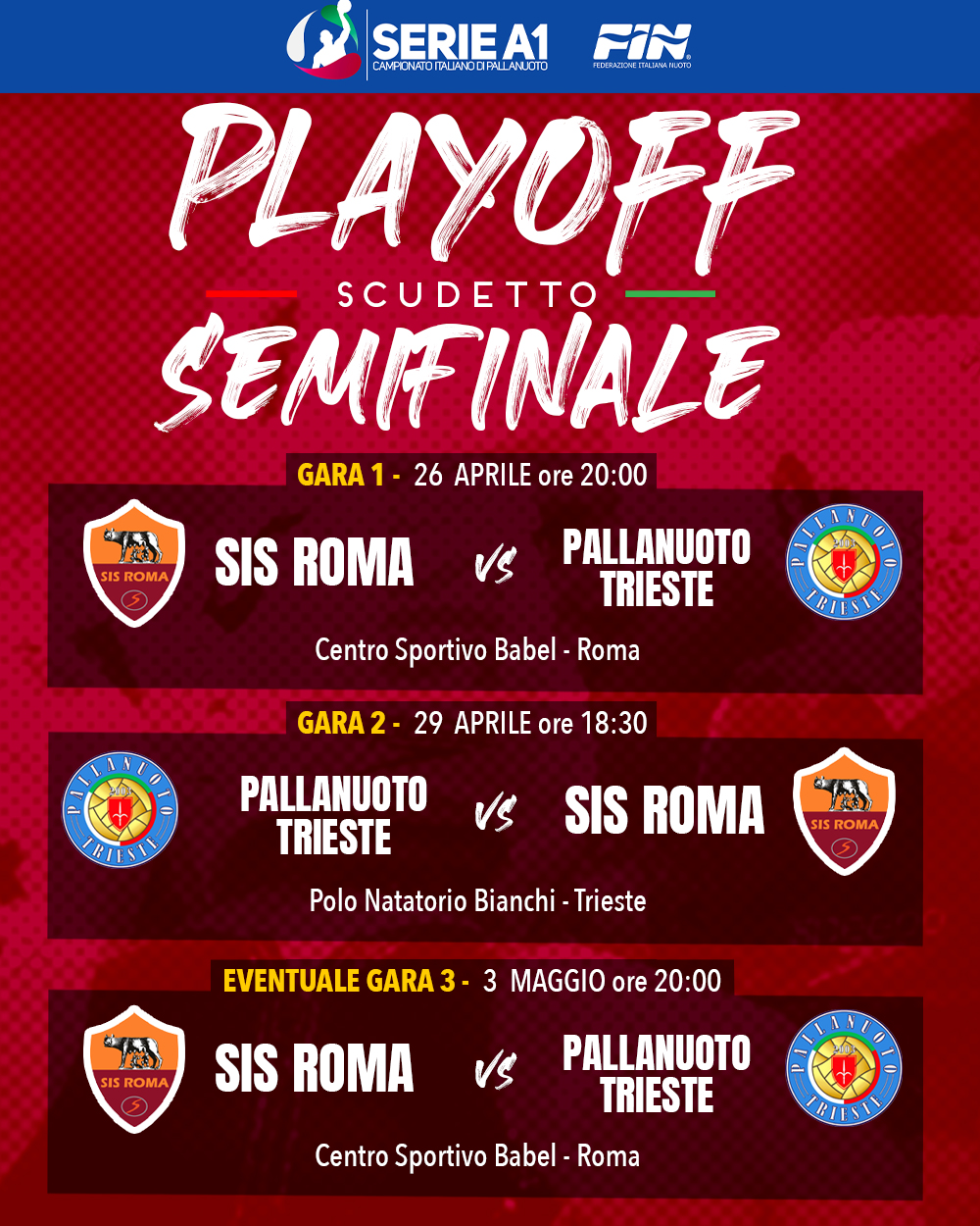 Dopo la parentesi del “sette rosa” riparte il massimo campionato di pallanuoto femminile con i play off scudetto e la SIS Roma, mercoledì 26 aprile, ore 20, nella piscina del Babel (via Traetta – Infernetto) affronterà il Trieste per staccare il biglietto per la finale. Nell’altra semifinale saranno difronte le venete del Plebiscito Padova e le siciliane, campionesse d’Italia in carica, dell’Orizzonte Catania.